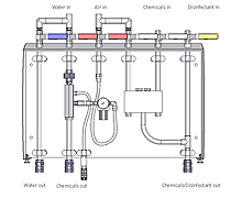 - A unique concept consisting of a mixer unit for central dosing of chemical and disinfectant solutions, as well as an injector for an optional chemical solution.