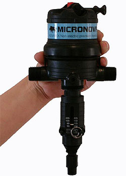 Our Micronova low-flow, fluid (water)-driven proportional injector offers a low cost alternative to traditional, electric technology. One of the smallest injectors on the market, the compact dimensions make it ideal for applications requiring tight installations (approx. 3”d x 5”w x 9h”). Unlike traditional electric pumps, Micronova injectors eliminate the need for electricity and can operate in remote areas. They are easy to install and maintain - making them ideal for low-flow injection applications.