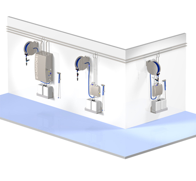 Običajno se enota z vodno črpalko nahaja v ločeni sobi, od koder cevi vodijo do satelitskih postaj, ki so v proizvodnji. Vsaka satelitska postaja je sestavljena iz avtomatskega navijalca za cevi ter cevi za vodo, kemično raztopino in razkužilo. Čistilna pištola Triggless® II in šoba za predpranje sta nameščeni poleg satelistske postaje.