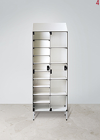 8. AI506/180 IN Model garderobne omarice z vrati iz pleksi stekla, odprtimi policami in z nagnjeno streho.