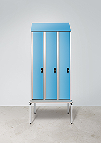 Tridelni model garderobne omarice (razdelek širine 30 cm, višine 150 cm), s klopjo, linearno strukturo in ravno oziroma nagnjeno streho.