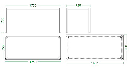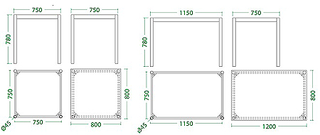 Jedine mize, izdelane iz laminata debeline 14 mm in z nogami iz nerjavečega jekla, premera 45 mm (AIAI 304).