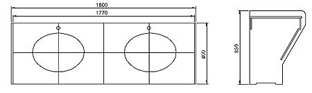 Primer umivalnikov, nameščenih na steno. Izdelano iz laminata z zaokroženimi robovi. Umivalnik je lahko keramičen ali iz nerjavečega jekla. Vse komponente so odporne proti rji. Pipe niso vključene.