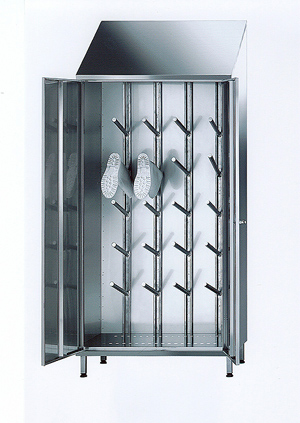 Stainless steel boot storage cupboards with various no. of doors, for 12, 24 or 32 boots for boot storage. Dustproof slanting top, handle lock with key, screw on adjustable feet.
