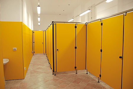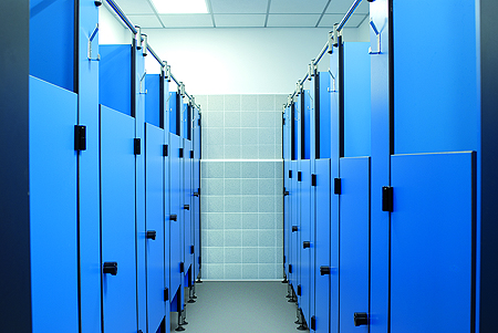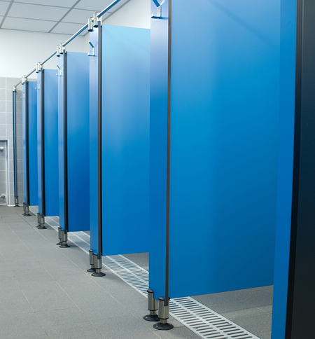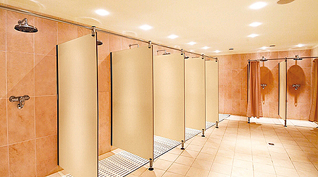 HPL Laminate shower partition panels, stainless steel accessories and PVC floor grids